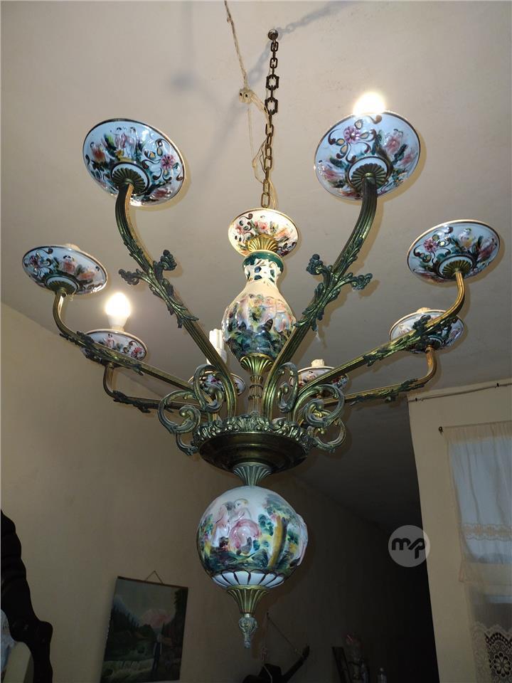Vintage Chadelier featuring brass arms and hand-painted porcelain floral details