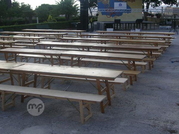 8ft long benches. material wood and legs fold-able with appropriate hinges. Locally manufactured, Large quantity available and easy to store and transport.