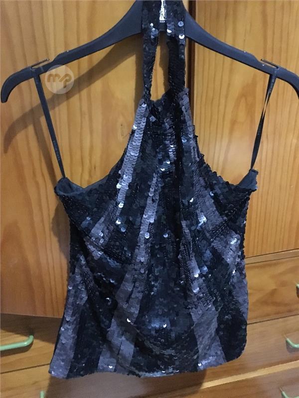 Evening top black dark grey sequins beautiful halter neck.Size small would say large size 8 or 10 uk. 36 or 38 Eur. 15€ like new.Clothes worn only once on occasion.mob 79906986.