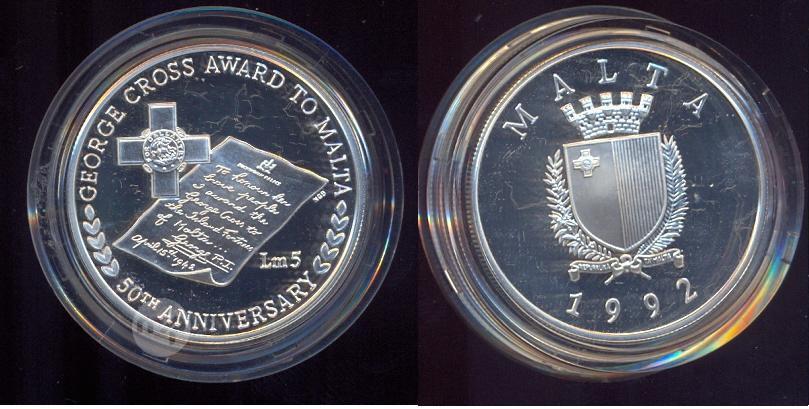 MALTA 1992 HAMES LIRI PROOF TAL FIDDA GEORGE CROSS 50th ANNIVERSARY (WITH BOX AND CERTIFICATE)