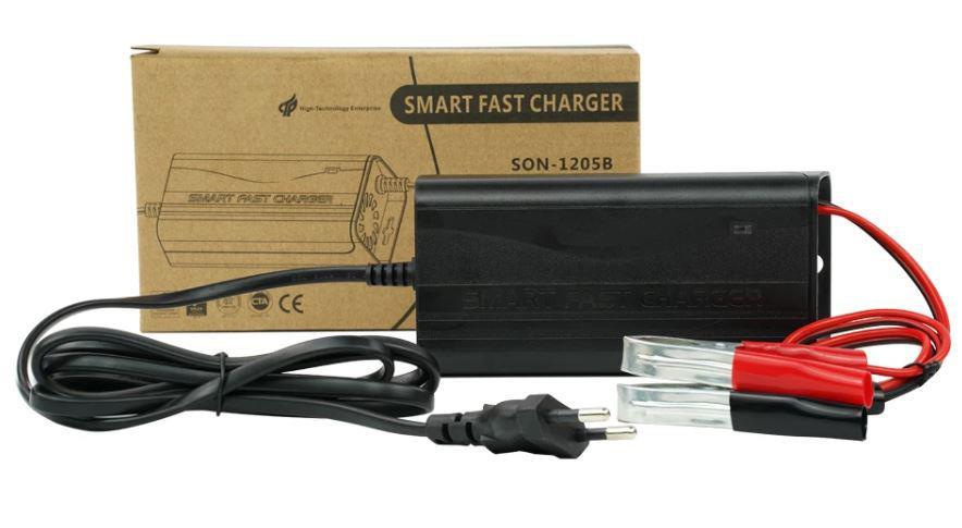 Battery charger for 3/5/10A 12V fast charging vehicle batteries NB: Some details may differ from those shown in the image Characteristics Model: SON-1205B Input voltage: 100-240V Output voltage: 12V Fast charging: 5A max Frequency Response: 47-63Hz Power factor: greater than or equal to 0.85 Charging efficiency: greater than or equal to 87% European plug Positive/negative terminals for battery poles Built-in cooling system