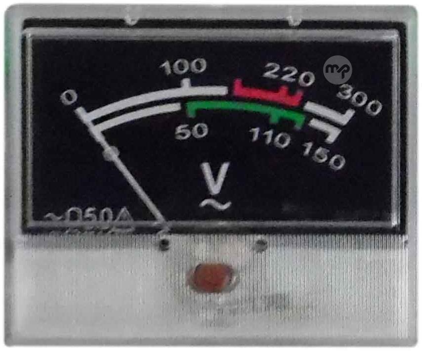 300VAC analogue panel voltmeter with black dial Dimensions: 55x47x10mm