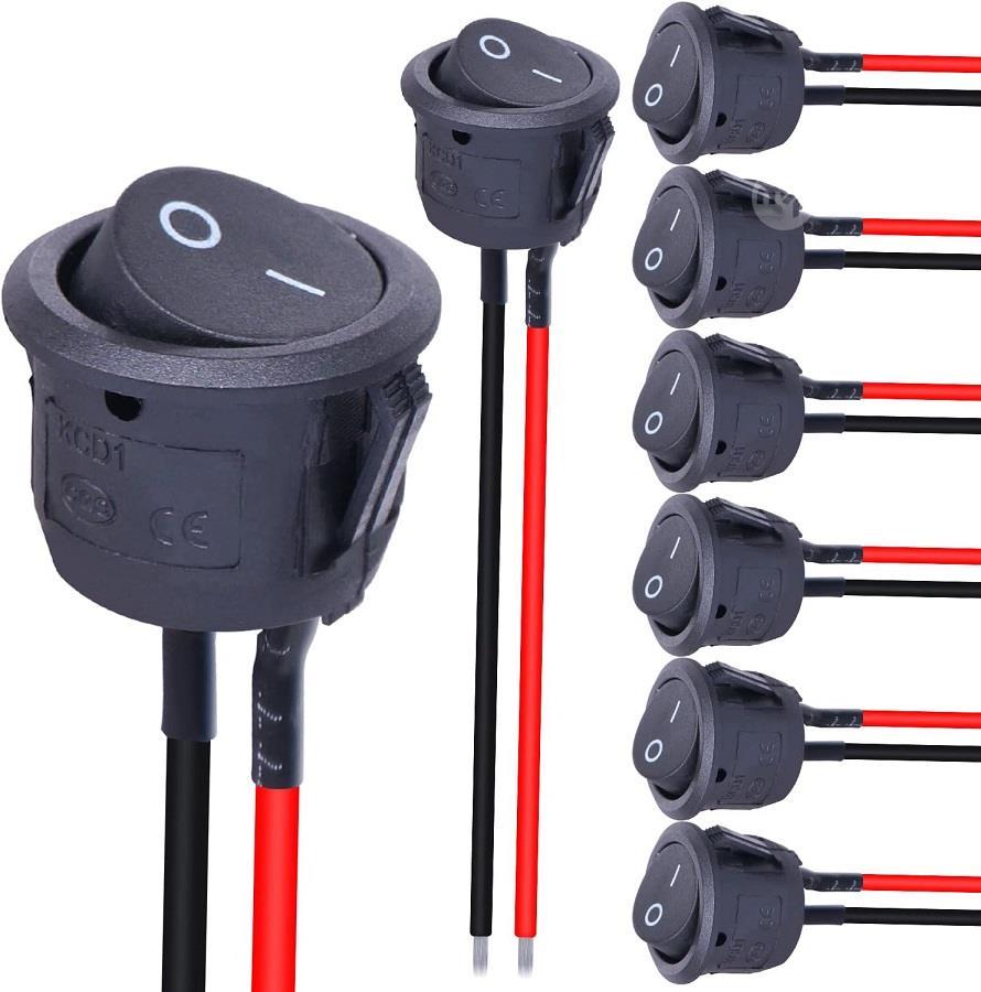Rocker Switch 2 Position SPST 2 Pin 10A 220V-250VAC - Pack of 10 Characteristics Black colour Dimensions: 21x15mm Positions: 2 (ON / OFF) Terminal: 2 pins, soldered with 2 wires Voltage and current: AC 6A / 250V 10A / 125V Switch life: 20000-40000 times Cable length and diameter: 22cm/8.66" and 2mm/0.08" Package: 10 black push button switches with solder wires Material: plastic and metal