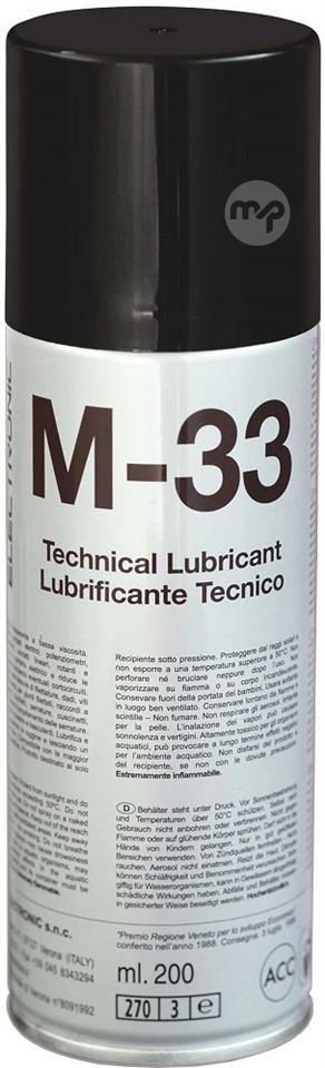 M-33 Technical Lubricant 200ml DUE-CI M-33 Technical multipurpose lubricant spray, transparent and low viscosity. Thanks to the very low surface tension the sprayed product is able to penetrate easily and in a short time even in the narrowest and most difficult cracks of threads, nuts, screws or other. It is therefore excellent for small and medium mechanical applications, with excellent results as a release for threaded joints, screw fittings, bolts, supports, padlocks, locks, bearings, gears, etc. Features In cans of 200ml Manufacturer Due-Ci Electronic Prevents locks from freezing Eliminates squeaks from doors, windows and garage doors Lubricates and penetrates deeply, melting the rust and leaving a thin anticorrosive layer Can be used as a cleaner and restorer of electrical contacts, potentiometers, micromotors, connectors, linear contacts , rotating and sliding Favors electrical contact and reduces current leakage, limiting any possible short circuits Compatible with most plastics Cod ice EAN: 8012528011330