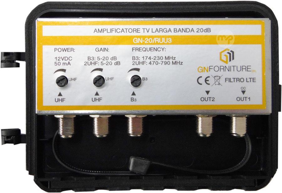 Tv amplifier 20dB 2out GN-20 / RUU3 2OUT The new series of pole-mounted amplifiers with "F" connection has been designed to meet the various needs of receiving TV signals and to comply with the regulations regarding the CE marking. They are made entirely in SMD technology on a printed circuit, the housing is made of shockproof plastic resistant to atmospheric agents. Powered at 12V DC via the down coaxial cable, they have good linearity over the entire amplified band.They are all with separate B3 / UHF amplification and adjustable gain at the inputs and enjoy an excellent signal / noise ratio with low intermodulation coefficient. Suitable for single systems even with more than one socket, ideal for DTT reception. Features Number of inputs: 3 Number of outputs: 2 Amplification B3 / UHF separate UHF frequency range: 470-790 Mhz B3 frequency range: 174-230 Mhz B3 gain range: 5-20 dB UHF gain range: 5-20 dB Power supply 12V 50 mA Integrated LTE filter