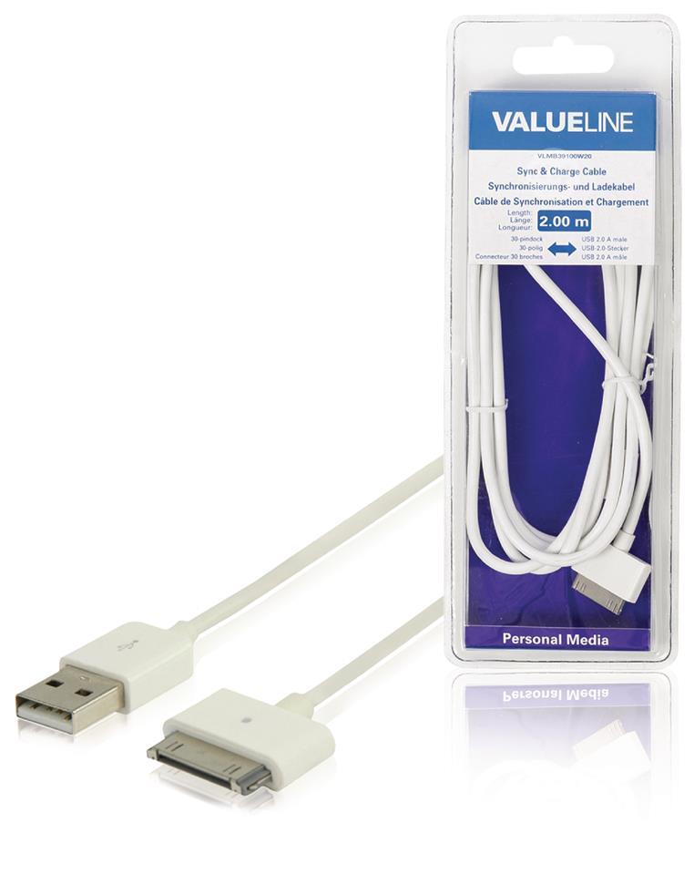 Sync and Charge Apple Dock 30-Pin - USB A Male 2m White This sync & charge cable is designed to sync your iPhone, iPod or iPad with your PC. Compatible with • iPod touch 4th generation 8GB, 32GB, 64GB • iPod nano 6th generation 8GB, 16GB • iPhone 3GS 8GB, 16GB, 32GB • iPhone 4 8GB, 16GB, 32GB • iPhone 4s 16GB, 32GB, 64GB • iPad 16GB, 32GB, 64GB • iPad 2 16GB, 32GB, 64GB • iPad 3rd generation Product Specifications White color Blister packaging Round hollow design PVC outer material Conductor material Copper Nickel plating Connector design - A side Straight Connector Design - Side B Straight Length 2.00 m 3.1mm diameter Connection B USB A Male Cable type Apple 30-Pin Connection To Apple 30-Pin Dock 30/20 AWG rating Connection A & B Apple 30-Pin Dock - USB A Male EAN 5412810198498 VLMB39100W20