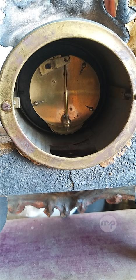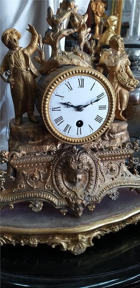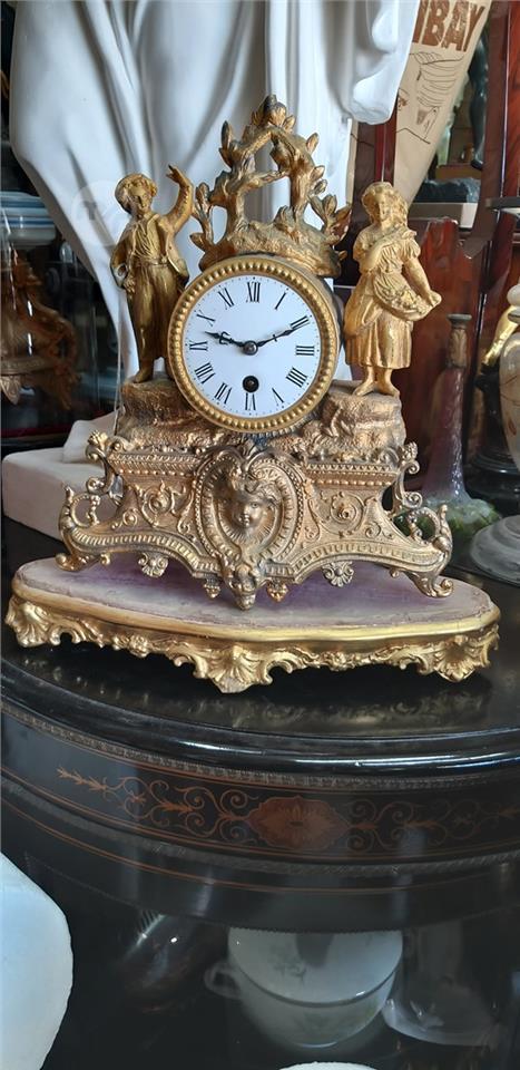French, around 100 years old gilded mantel Clock Roman dial numerals Complete with original plint,base. Price of 180 euros