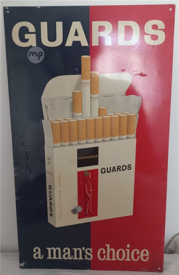 A large metal advertising sign for Guards Cigarettes, in good condition.