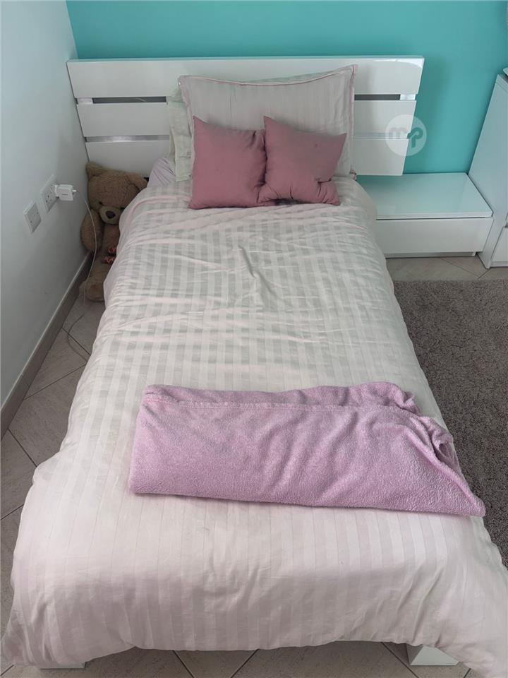 Reduced price for a quick sale. A gloss white finish complete bed in great condiiton, including 90X190 mattress and 1bedside table. Dismantling and transportation at your own cost.