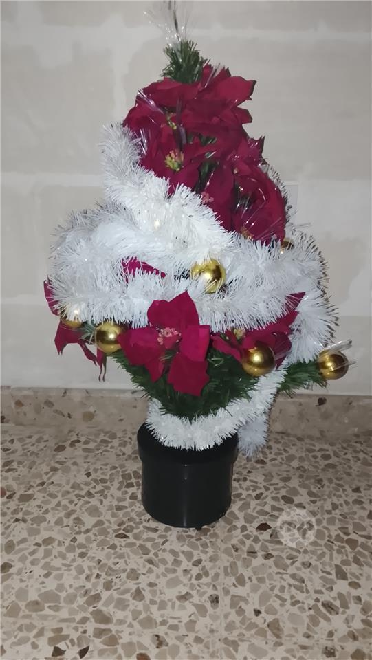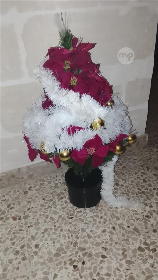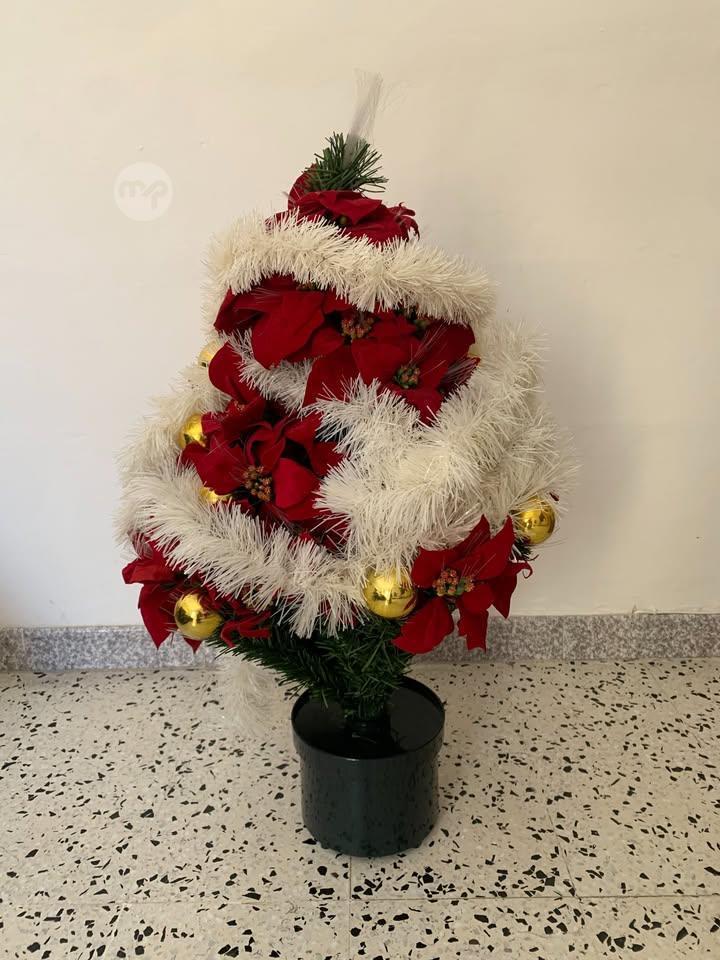Already decorated with white tinsel, ornaments, and plastic poinsettias.