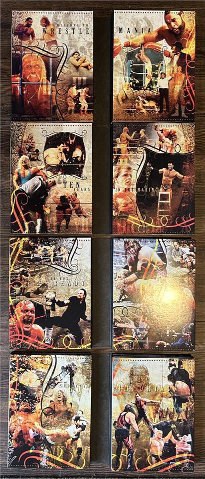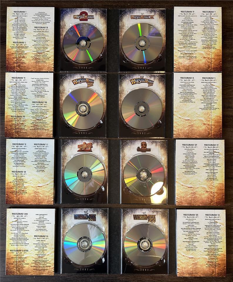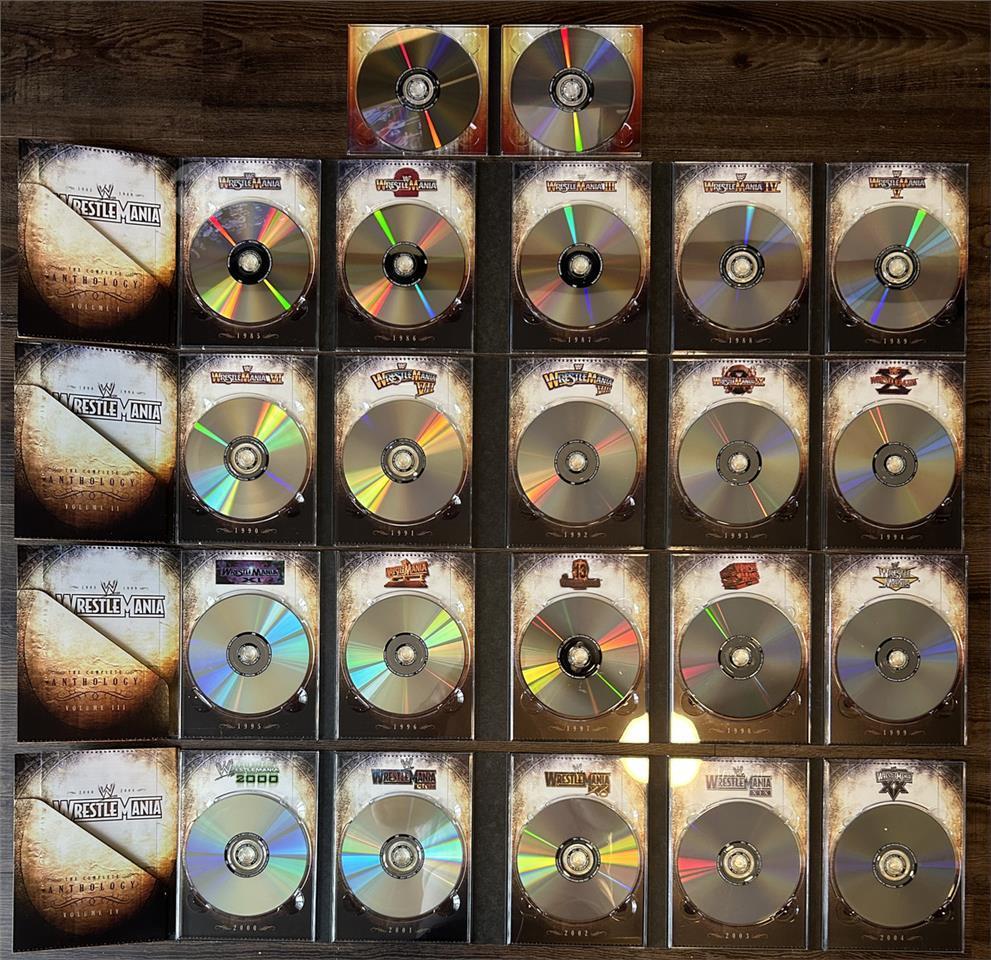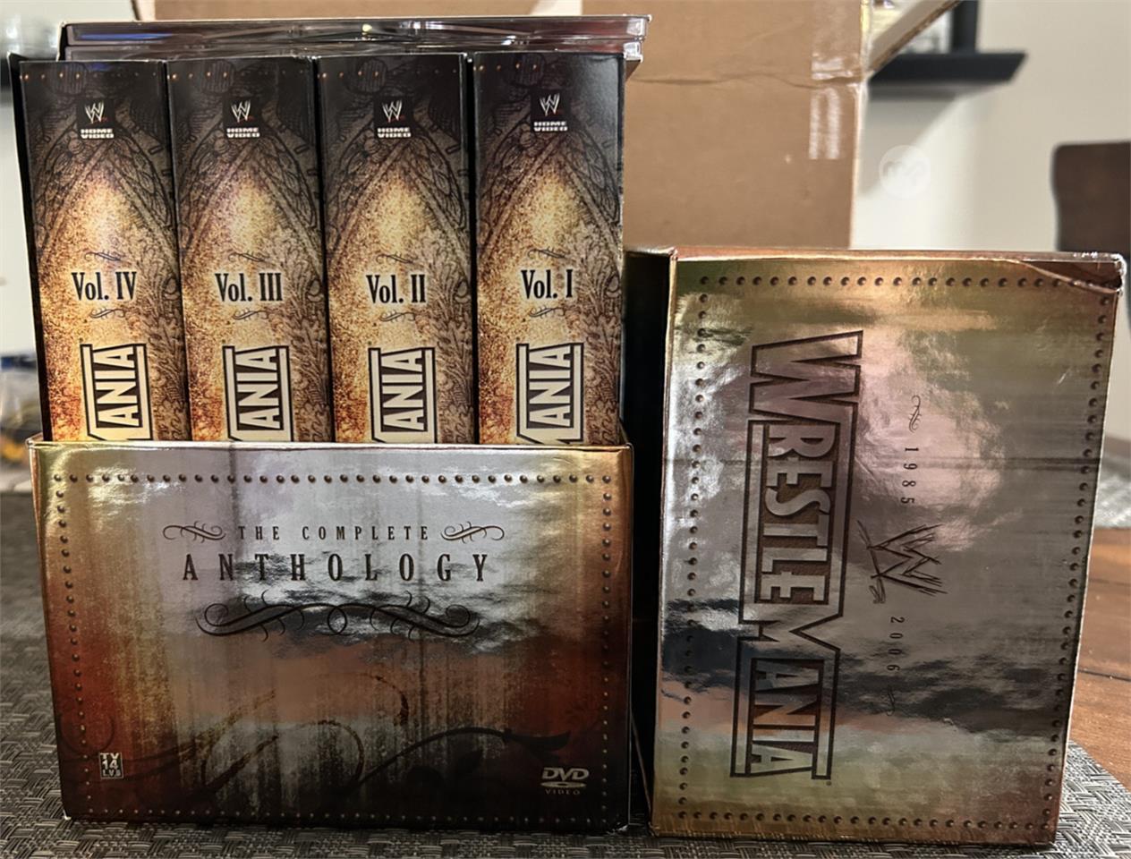 Volumes 1, 2, 3, 4, and 5 (complete 22-disc set) of WWE Wrestlemania: The Complete Anthology on DVD.