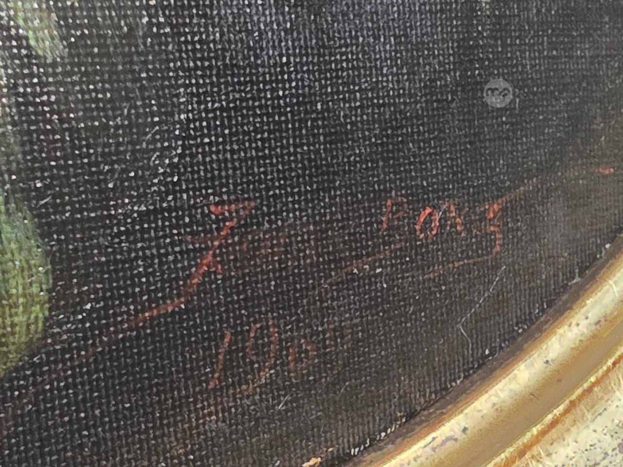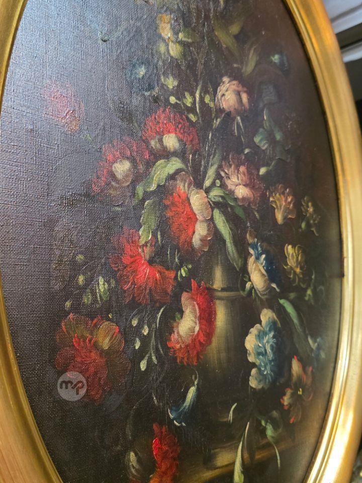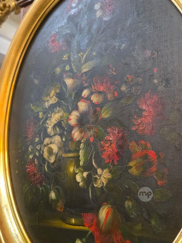 Pair Elegant "Frank Borg" Still life of Flowers paintings,mounted on beautiful carved wood gilded oval frames.