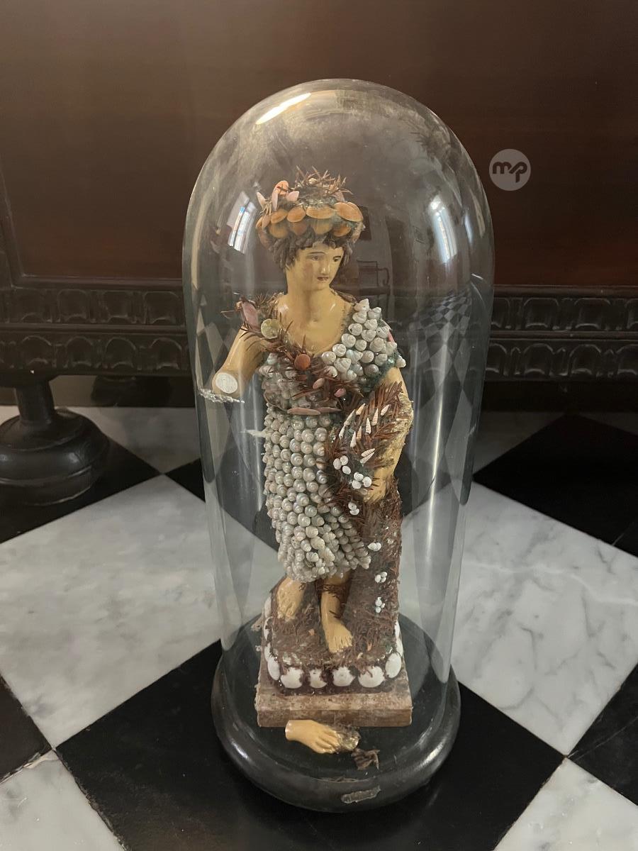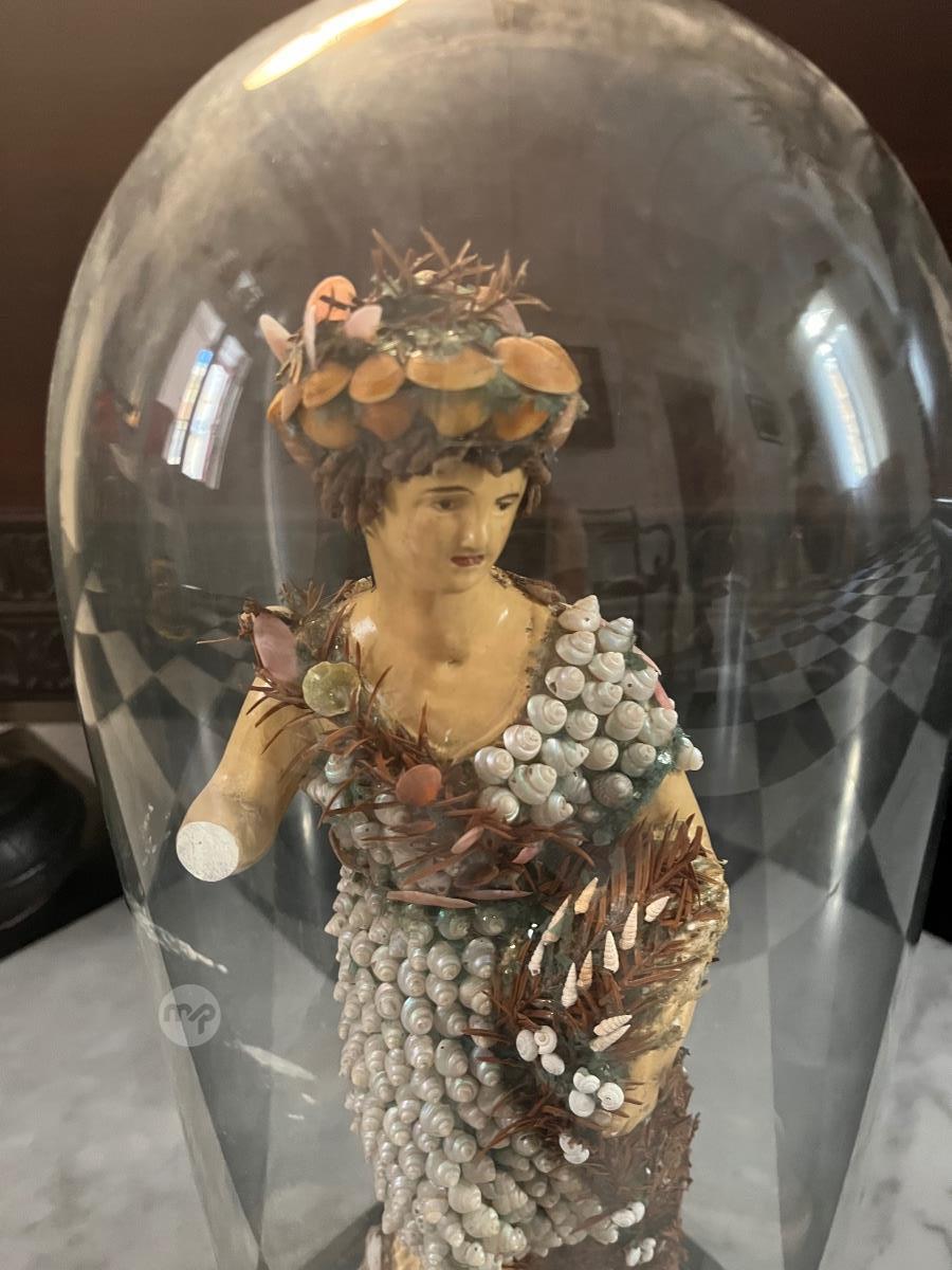 Antique unusual Victorian seashell figurine on wooden base, antique glass dome