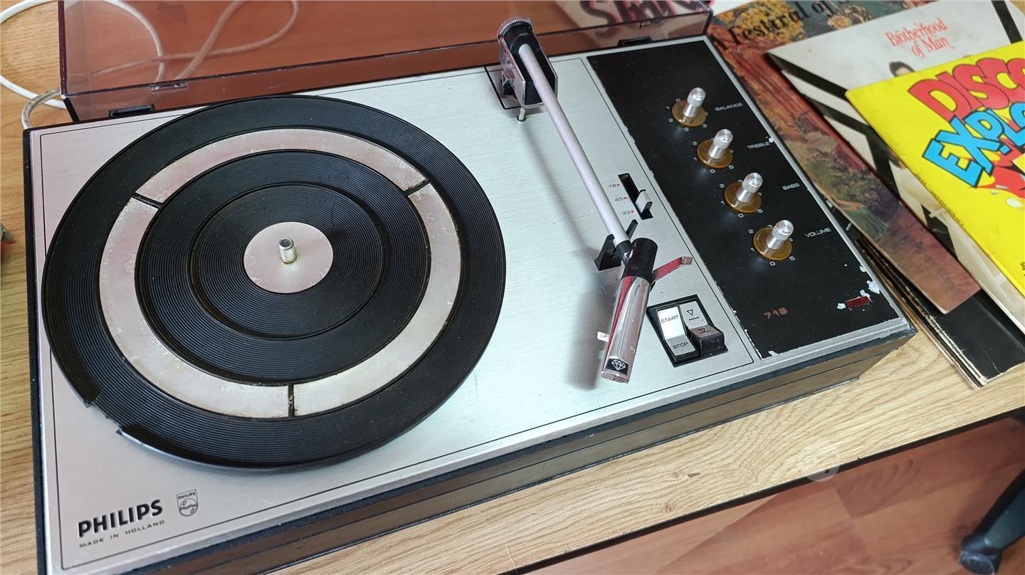 Features: Built-in controls (volume, bass, treble, balance), speed selector (33, 45, 78 RPM), automatic start/stop