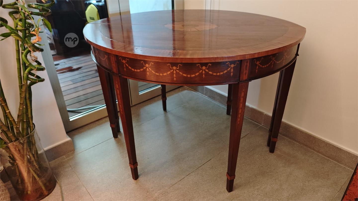 A rare pair of Antique Georgian Demi Lune Console Tables which can be used together as a Card Table. Both are in very Good Condition. They have elegant intricate marquetry and inlaid motifs. Approx diameter 112.5 cm and height 76 cm.