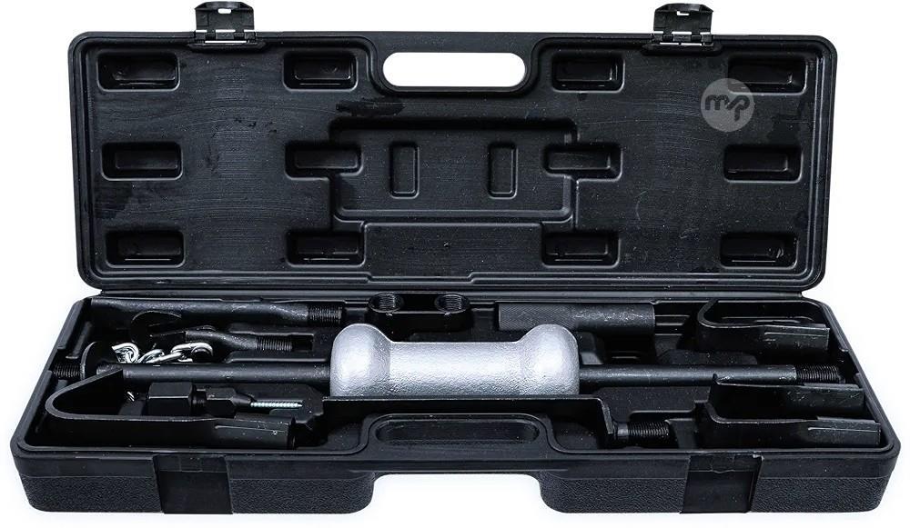 The dent removal set with slide hammer is a comprehensive tool kit specifically designed for professional vehicle repair. Featuring a robust 3 kg universal hammer and a variety of accessories, this set includes everything needed for bodywork dent removal. The 11 pieces consist of nine different hooks and accessories that allow for flexible application. The slide hammer thread with dimensions of 7/8" x 14 UNF ensures easy handling and compatibility with common tools. Made from high-quality chrome vanadium steel, this set guarantees durability and reliability in use. With a total weight of 8.09 kg, it is both stable and handy, making it an ideal choice for workshops and hobby mechanics.