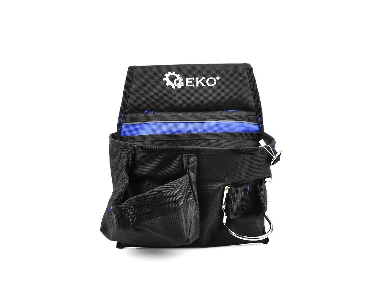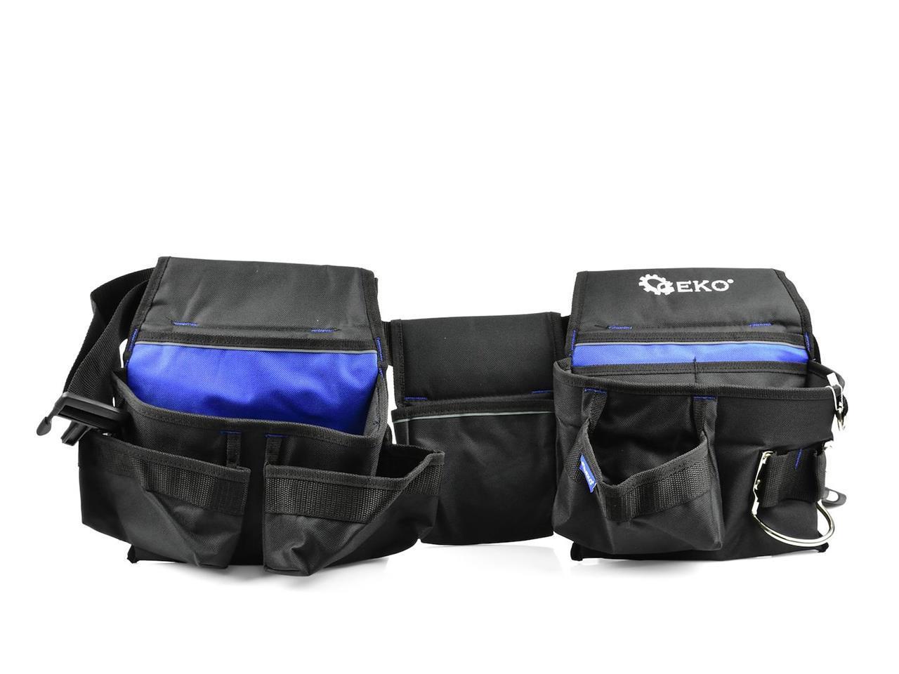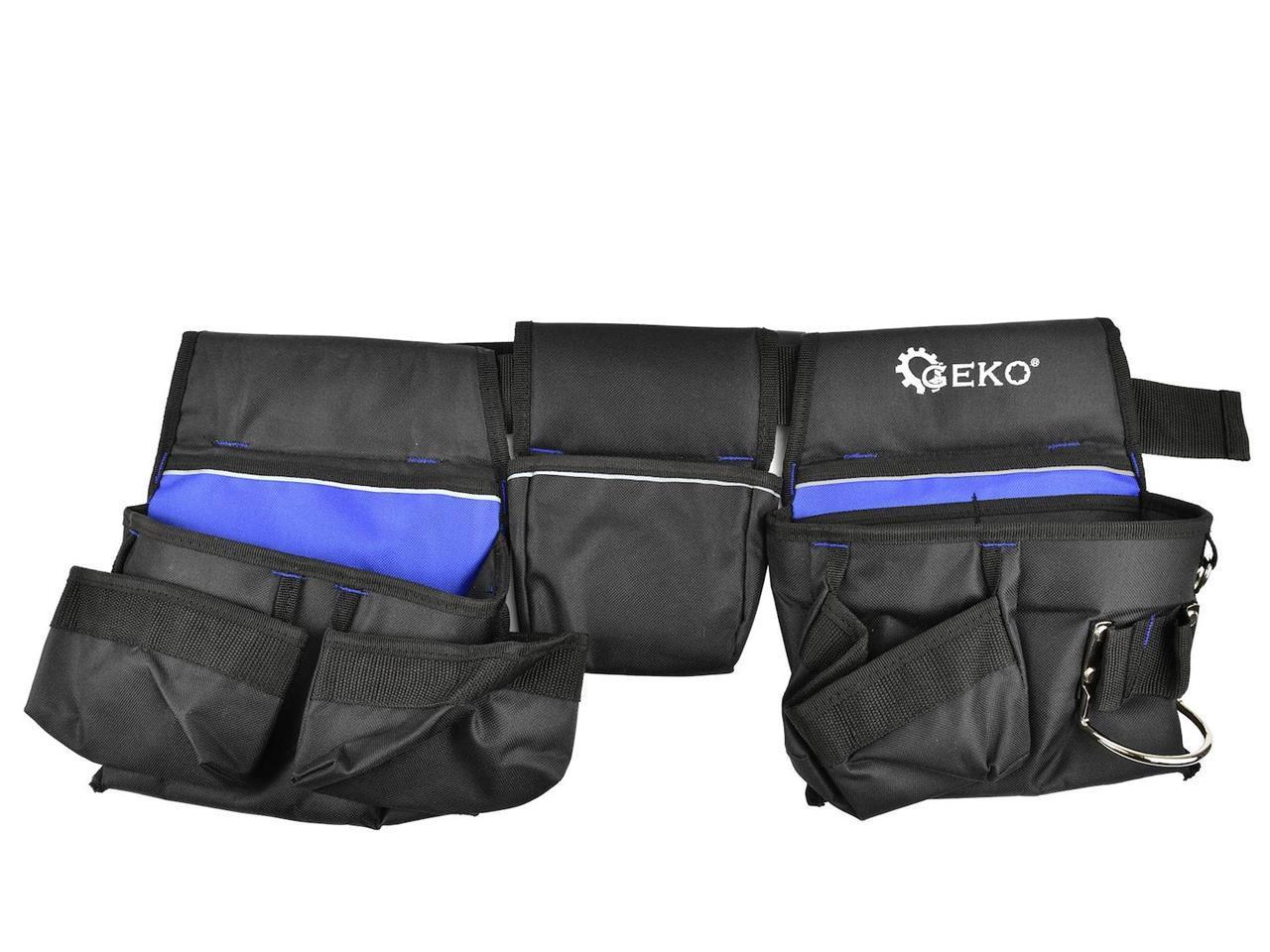 Belt with a set of three tool pouches, made from durable abrasion-resistant plastic material. It has a total of 10 pockets allowing for convenient carrying of various tools and accessories such as screws, nails, etc. Additionally, one of the pockets is equipped with an integrated handle for a hammer.