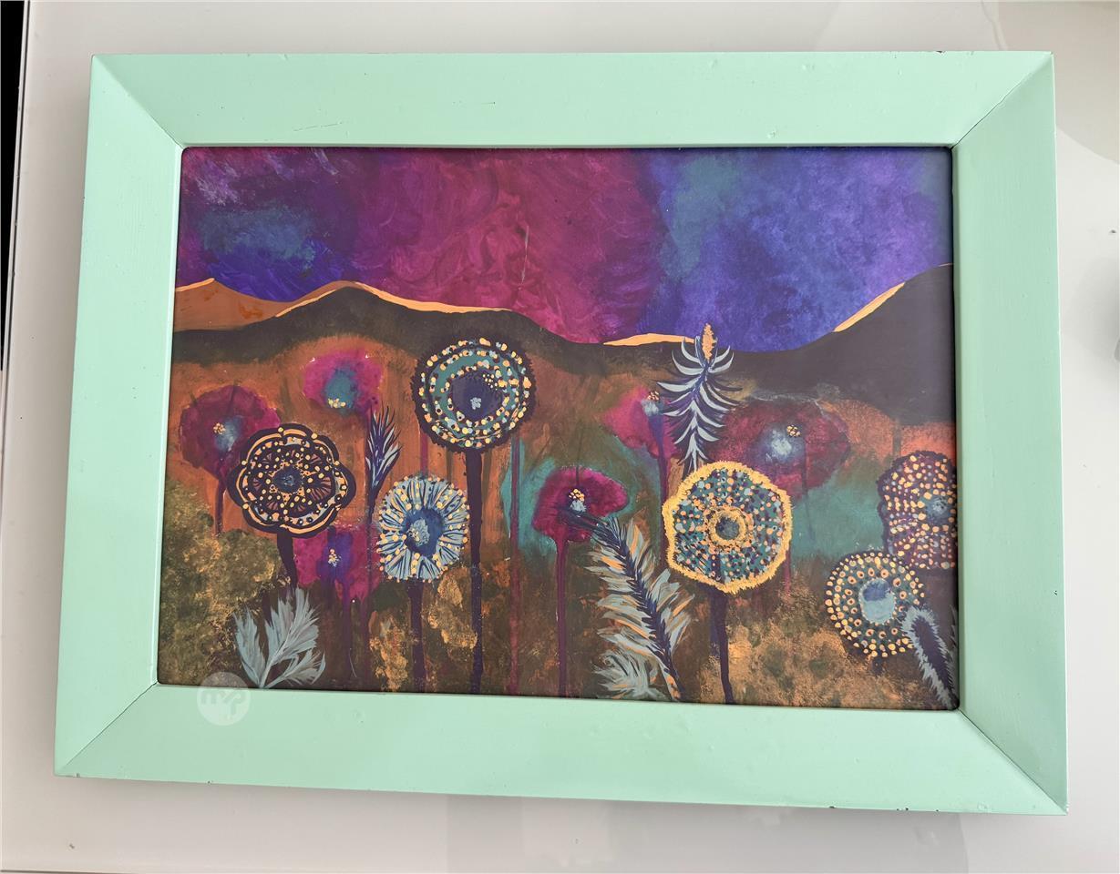 Acrylic watercolor flowers and mountains surreal cosmic painting