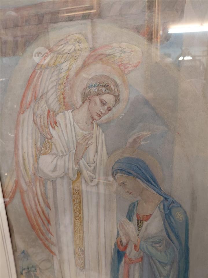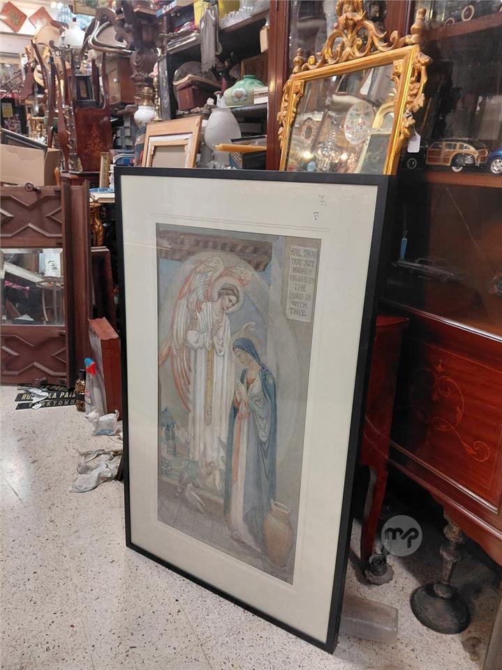 Large vertical Religious painting Showing the Annunciation Signed bottom right Jessie Bayes 1876-1970 Framed an in impeccable condition Measures 115x70 cm Price of 550 euros