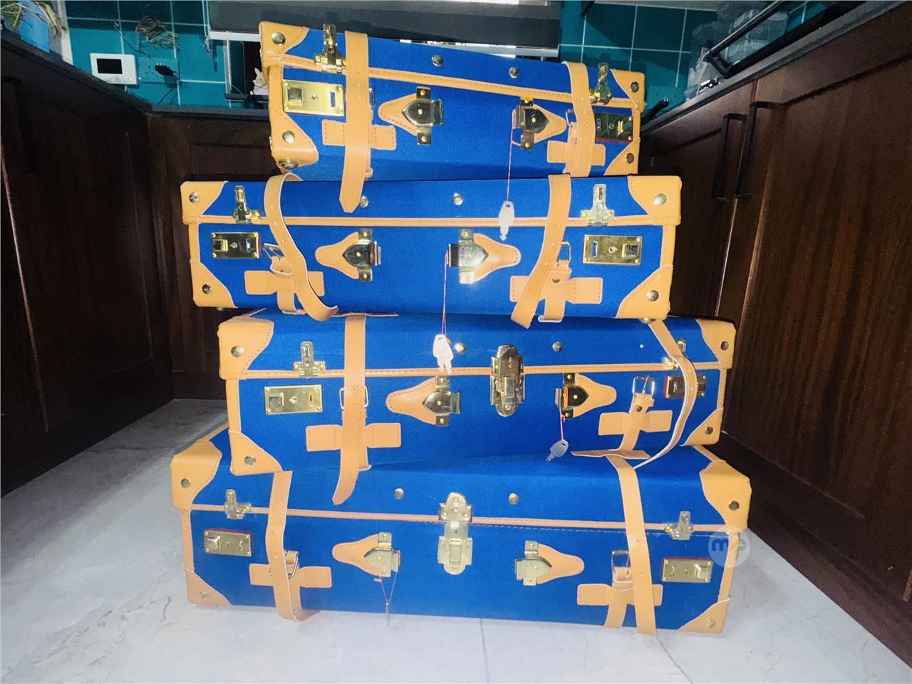 Vintage Style 4-Piece Nesting Luggage Set – Blue with Tan Straps – Brand New with Keys