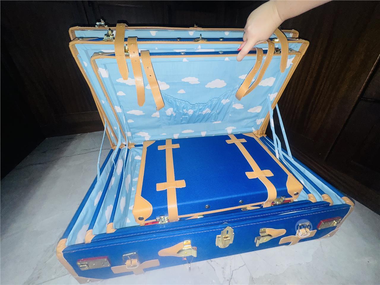 Beautiful vintage-inspired 4-piece luggage set in striking royal blue with tan leather-style straps and gold hardware. The interiors feature a light blue lining with a charming white cloud print.