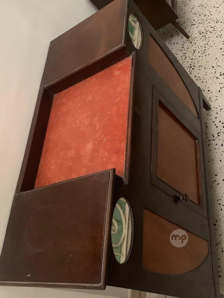 Art Deco Wooden Cabinet with Ceramic Insets – Red top with ceramic side panels – €165