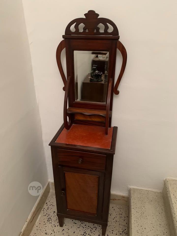 Antique Wooden Washstand/Vanity Cabinet with Mirror & Storage – Carved details, drawer + cabinet – €100