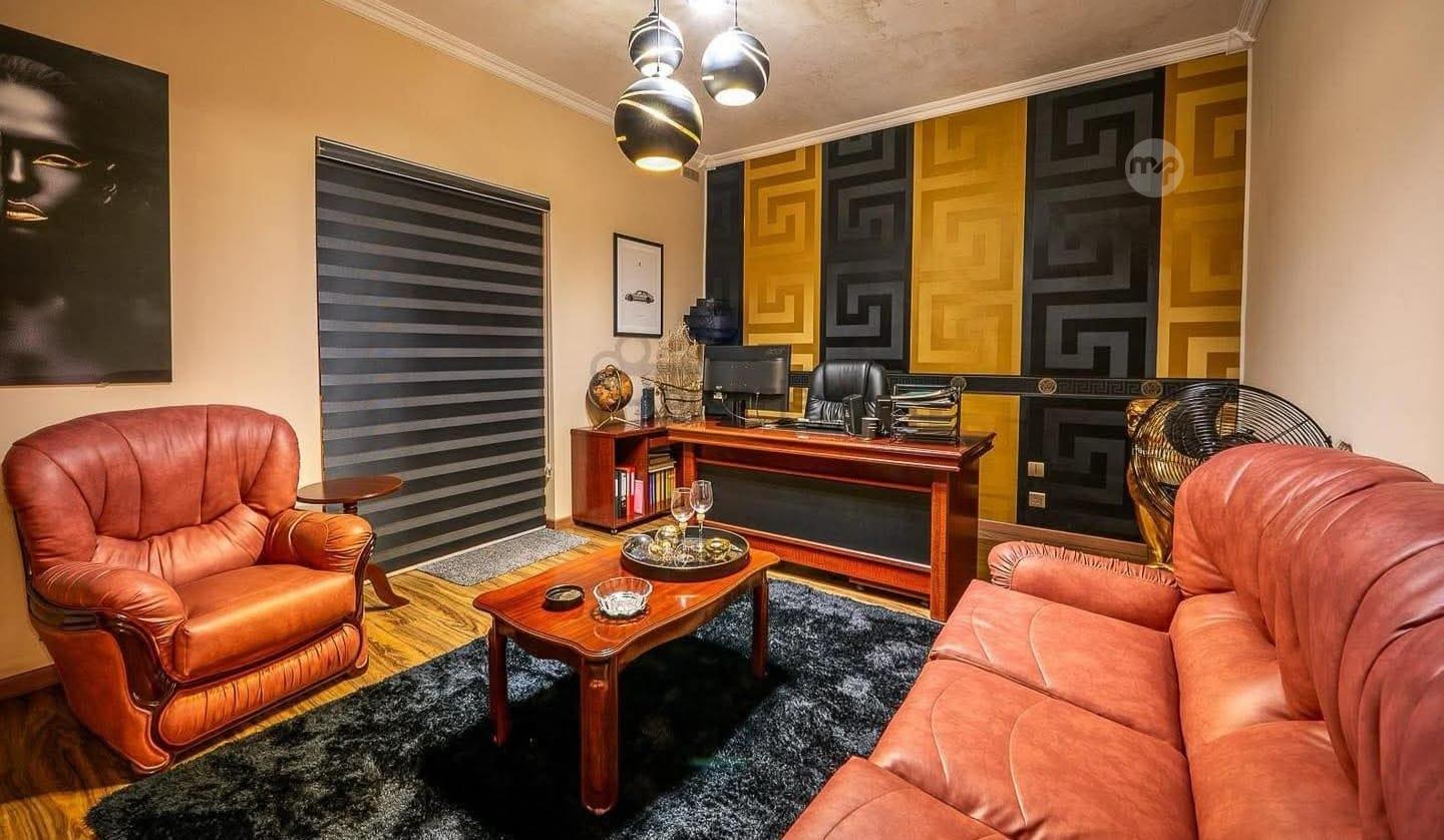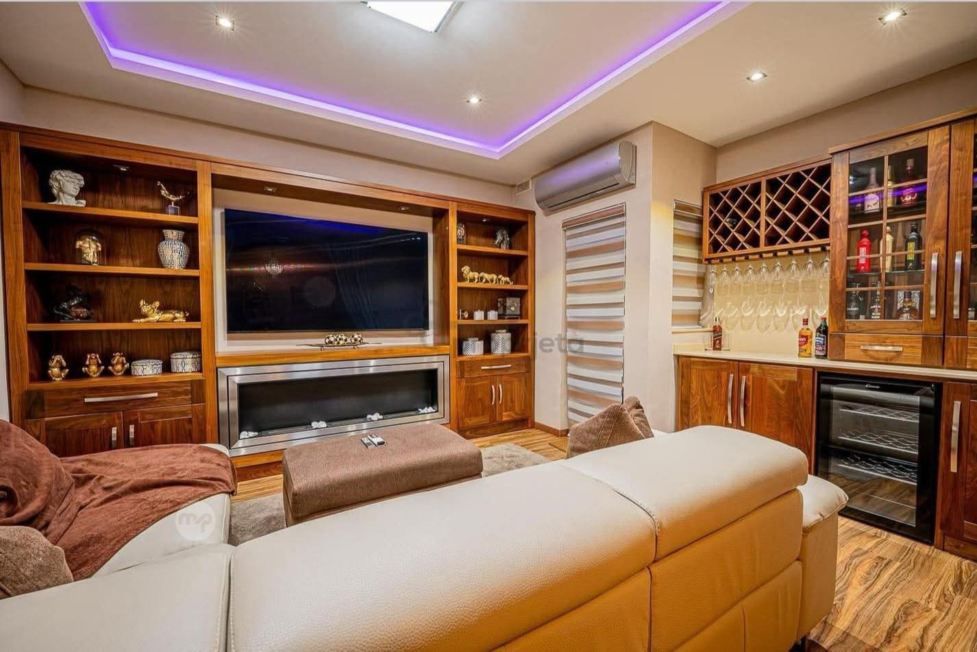 Fully furnished: kitchen, dining area, living room, bar, office, washroom/gym