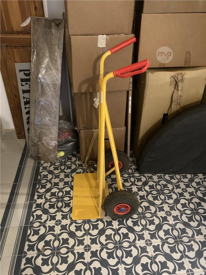 Sturdy yellow hand truck with solid steel frame and large pneumatic wheels. Ideal for moving boxes, furniture, or heavy items. Lightly used and in excellent condition. Easy to handle and very durable. Pick up from zebbug Gozo.