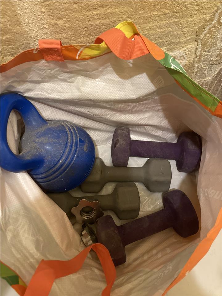 Full home gym set including adjustable bench, EZ curl bar, two dumbbell bars, several weight plates (around 50 kg total), and extra accessories. All in good condition, used occasionally.