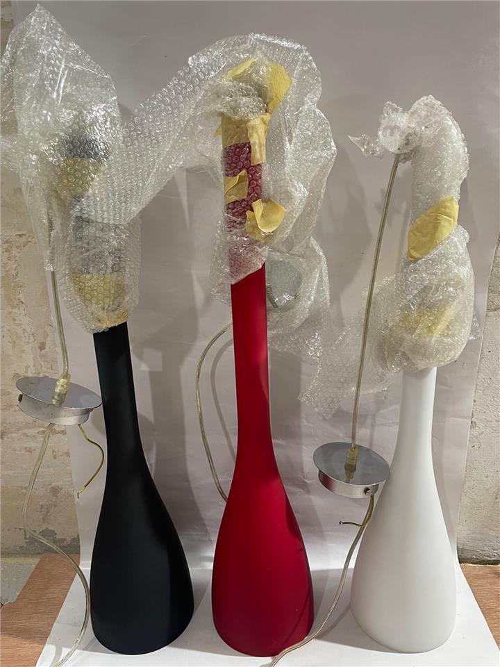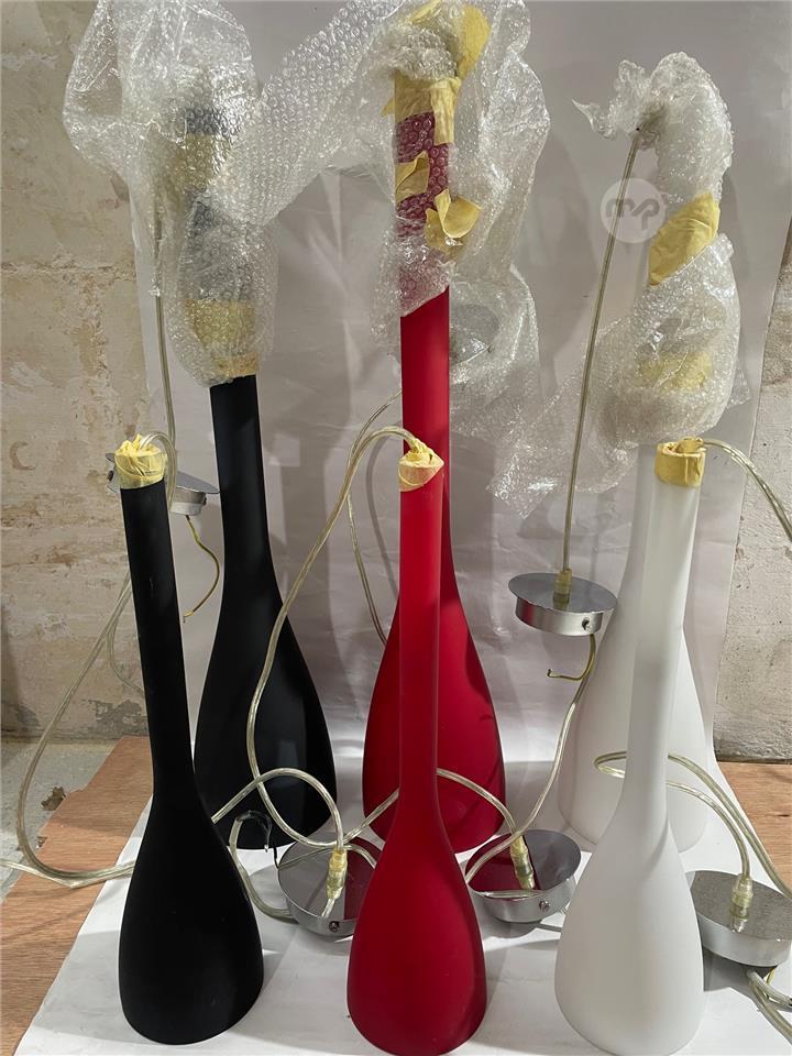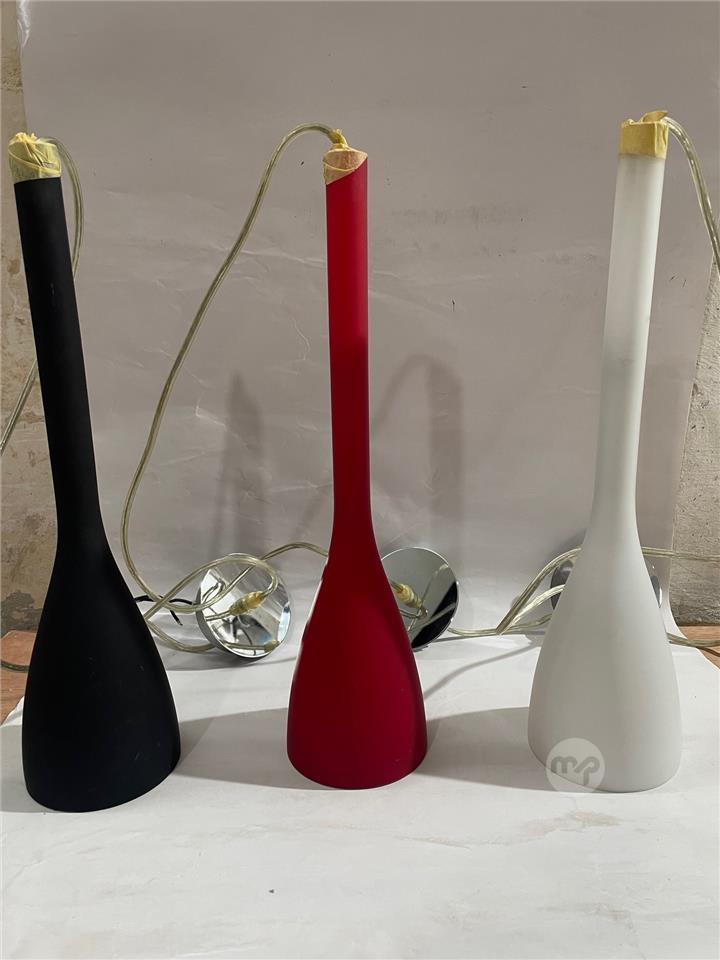 Pendant glass light fittings three small 42 cm long and three big 65 cm long for above bar, counter or kitchen island.