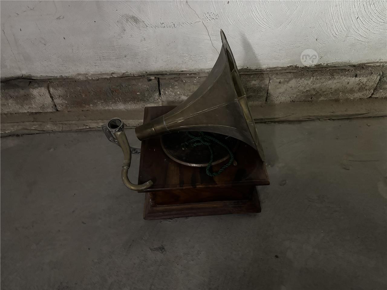 Beautiful vintage gramophone with a solid wooden base and striking brass horn. Classic display piece with great antique charm. Missing the small support piece that holds the horn upright, so it’s ideal for restoration or decorative use.