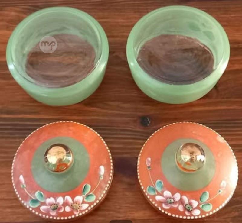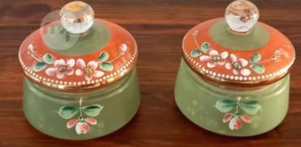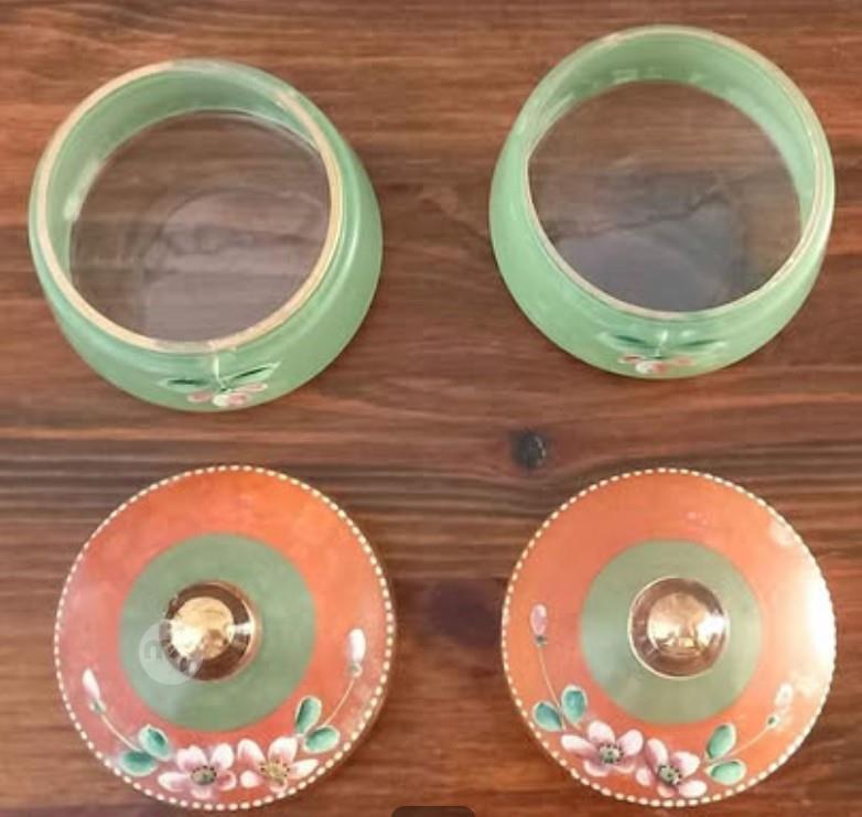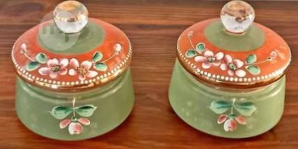 2 ANTIQUE VICTORIAN HAND PAINTED GREEN WITH FLOWERS GLASS JARS WITH LID -