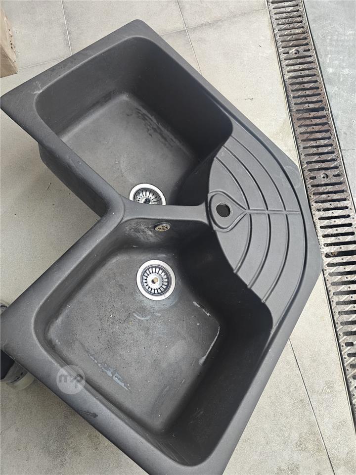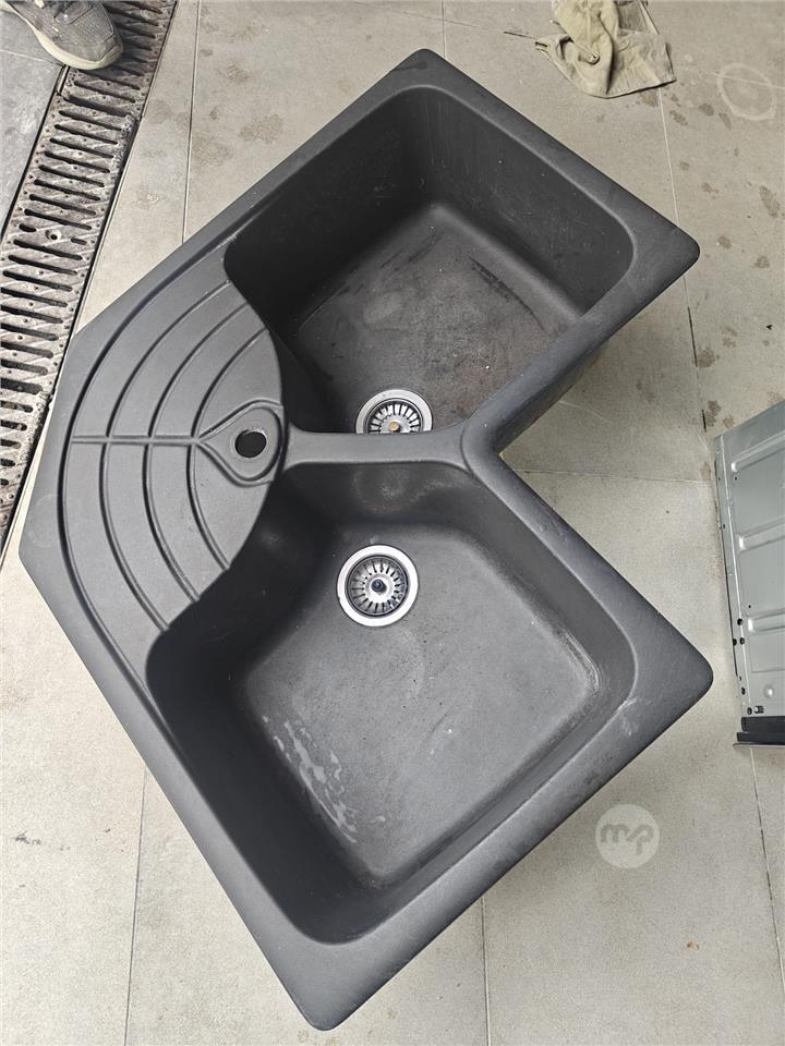Black corner kitchen sink with double bowls and integrated drainboard.