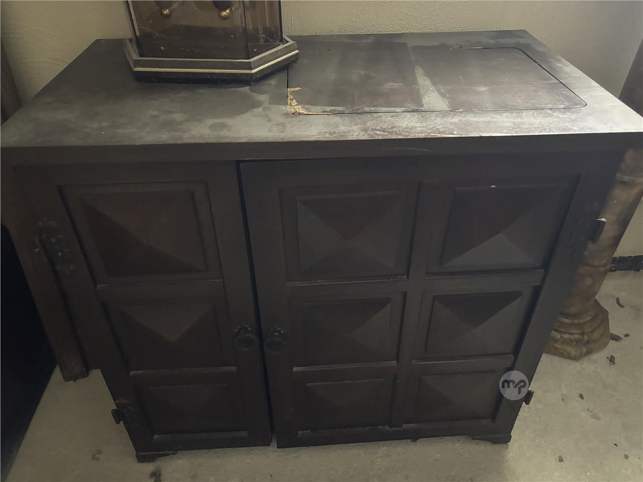 Beautiful vintage wooden sewing machine cabinet with fold-out top and double-door storage.