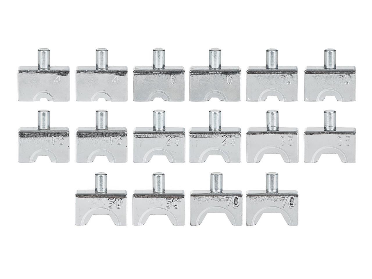 Interchangeable dies: 14 pieces, adapted for different wire diameters (4, 6, 10, 16, 25, 35, 50, 70 mm²).