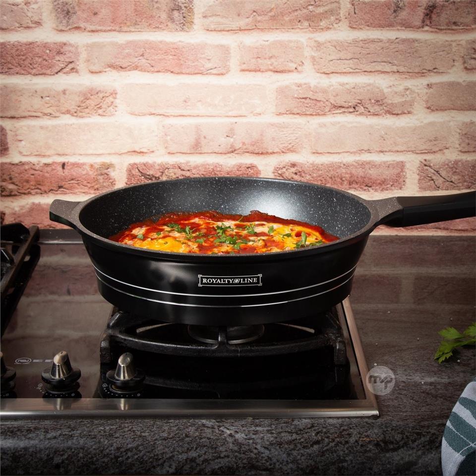 ROYALTYLINE ES1015M-BK 15pcs Set Cookware Cast Aluminum, Marble-coated, Dishwasher-safe, 3*Casserole, 1*Saucepan, 1*Frypan, 1*Grill pan, 4*Glass Lids, 4*Silicone Handles, 1*Removable Click-Handle, Black, 3 Year Warranty