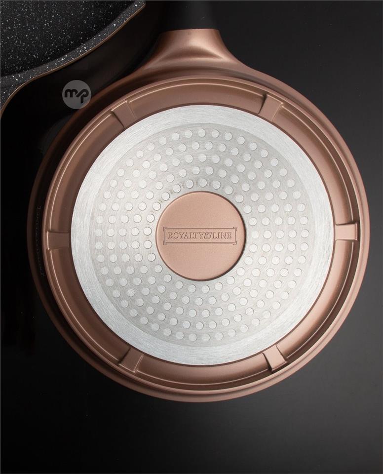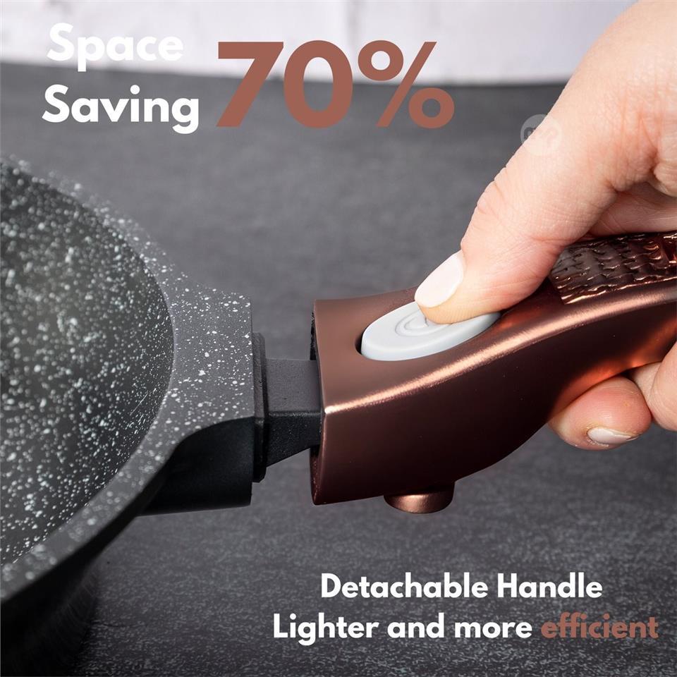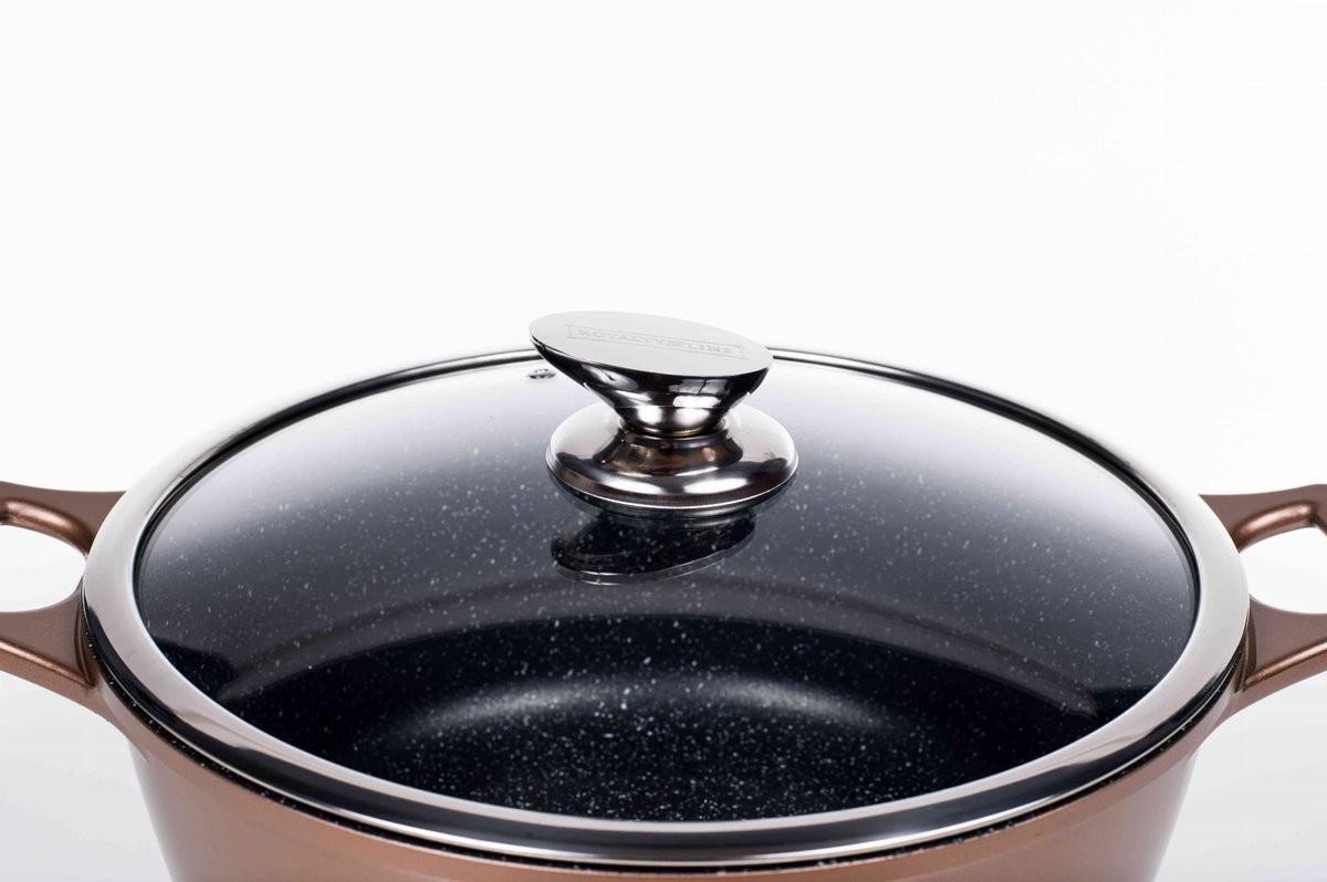 ROYALTYLINE ES2014M-BN 14pcs Set Cookware Cast Aluminum, Marble-coated, Dishwasher-safe, Induction-ready, 3*Casserole, 1*Saucepan, 2*Frypan, 4*Glass Lids, 4*Silicone Handles, 3*Removable Click-Handles, Copper, Brown, 3 Year Warranty