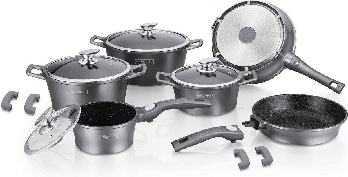 14 pcs, cookware set, silver, click handle, marble coated, glass lids, Royalty Line