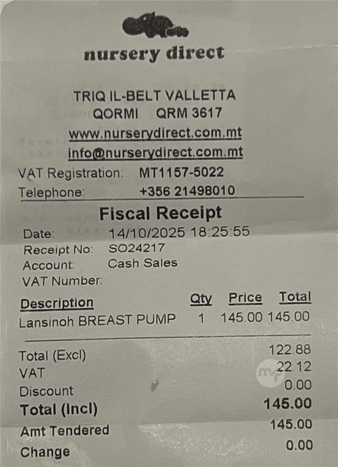 Lasinosh Breast Pump — bought on the 14th October 2025 for €145, used only twice and in excellent condition.
