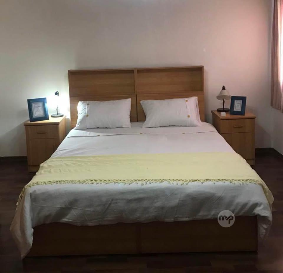 Double bed with headboard, shelf and storage cupboards (behind the pillows) with under-bed storage