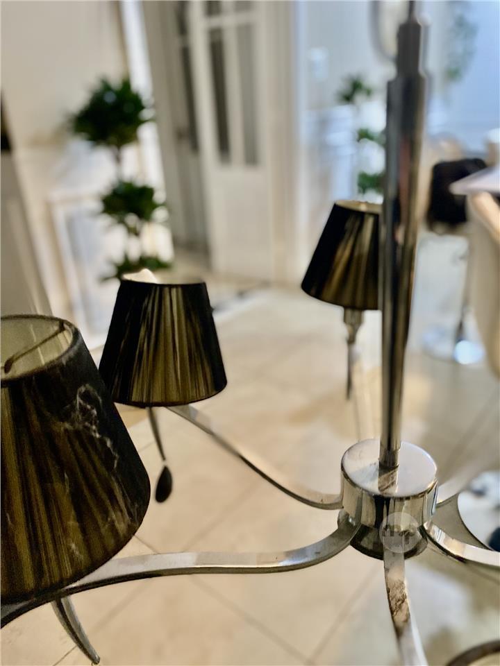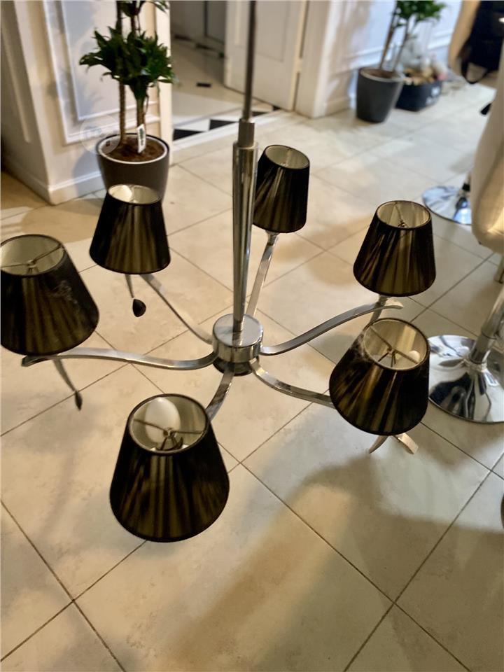 Elegant six-arm modern chandelier in polished chrome, featuring sleek curved lines and six black pleated fabric lampshades that create a warm, sophisticated glow.