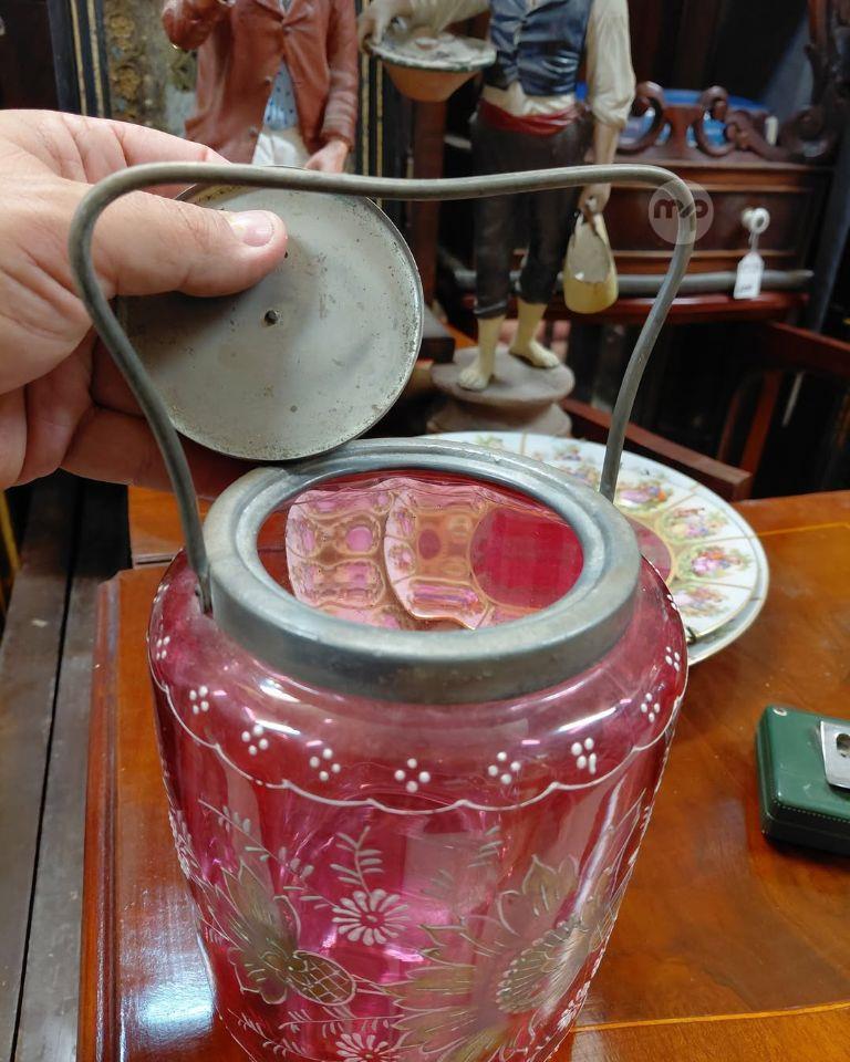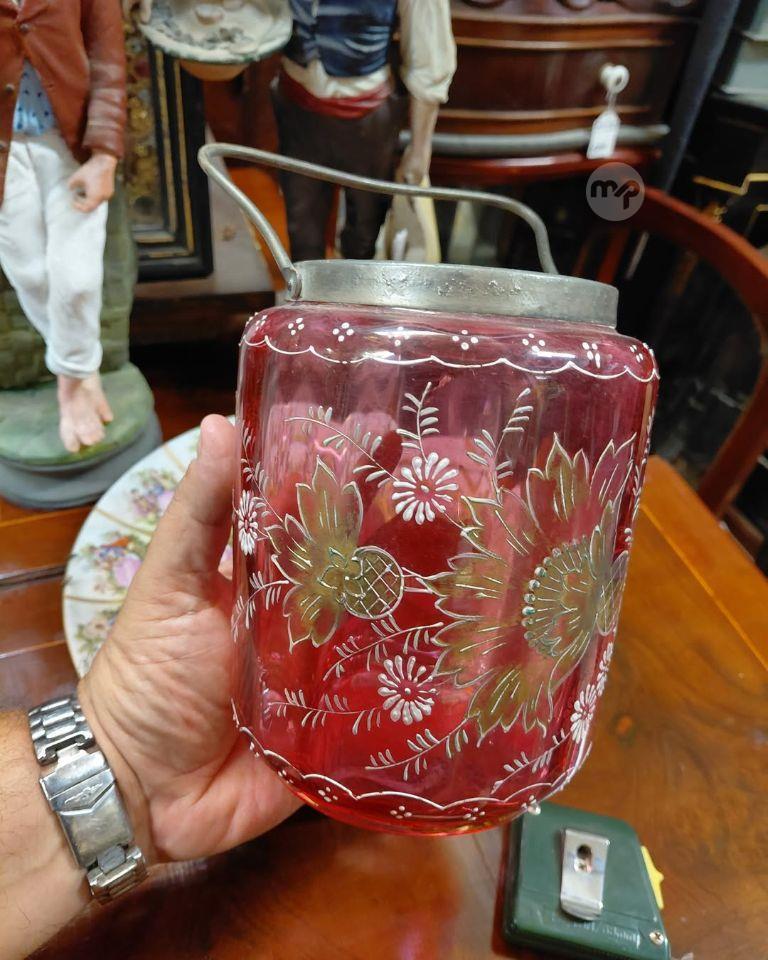 Antique Victorian Biscuits barrel RED CRANBERRY GLASS HAND PAINTED In perfect