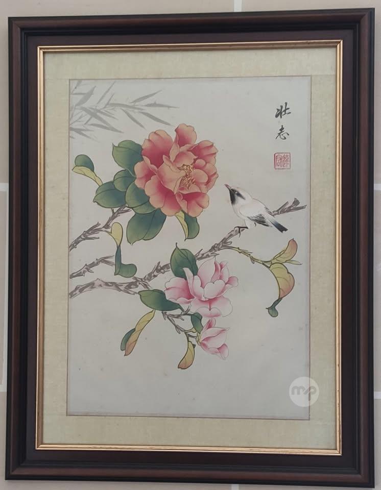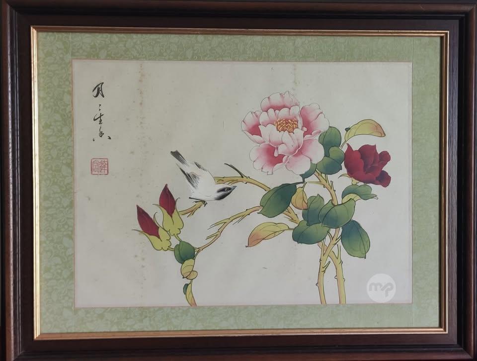 Vintage Set of Four Watercolor Paintings Framed - Symbols of Grace, Stillness, and Spirit. These paintings are a traditional form of Chinese art form where ink and coloured pigment are applied on Silk Fabric.
