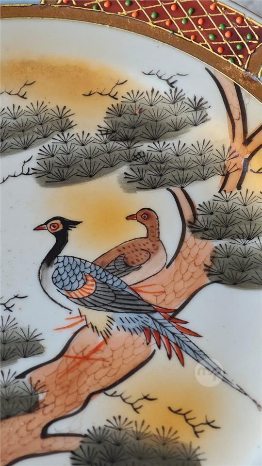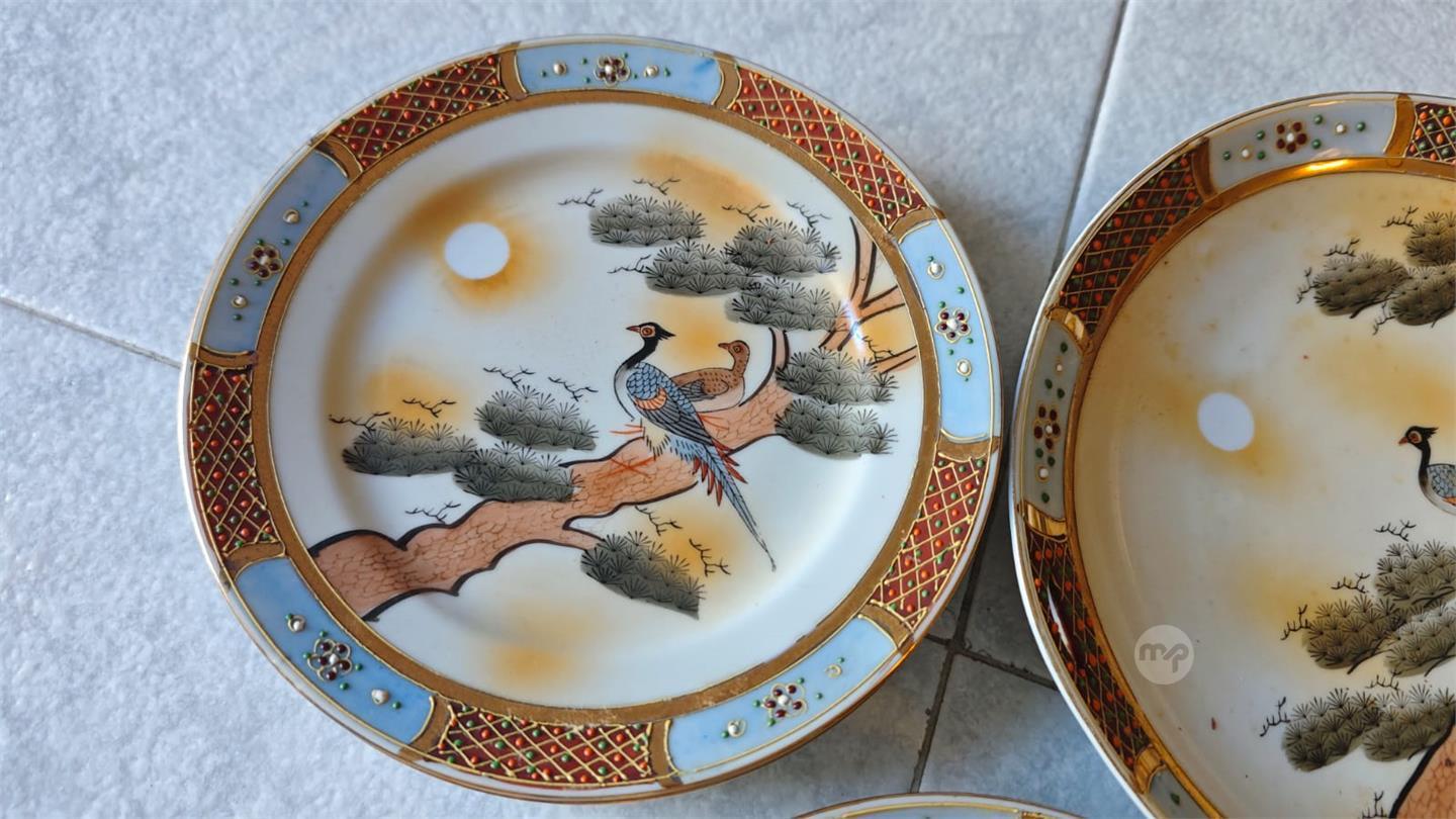 Set of 7 Antique Japanese Plates hand painted with vivid details depicting pheasants on a Tree branch. 6 plates have an approx diameter of 18.5 cm and the larger serving plate diameter of 24.5 cm.