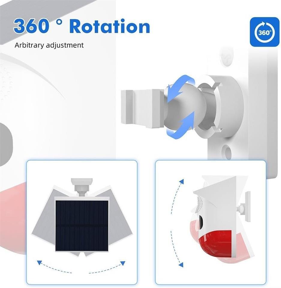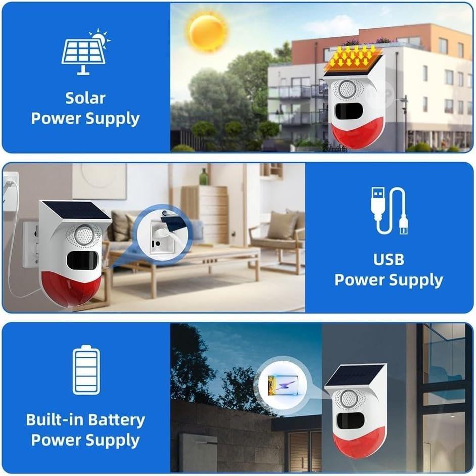 Solar-Powered Efficiency: Say goodbye to frequent battery replacements or complex wiring. This alarm is powered by high-efficiency solar panels that charge fully within 6-8 hours of sunlight. Its built-in high-capacity batteries ensure consistent operation, even in low-light conditions, with a working time of up to 60 days on a full charge.