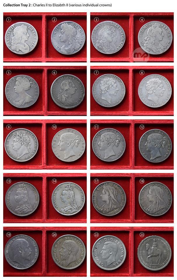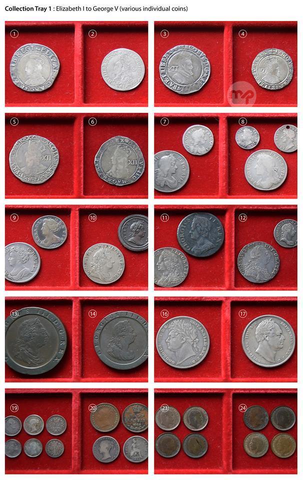 Various coins from Queen Elizabeth I to Queen Elizabeth II.