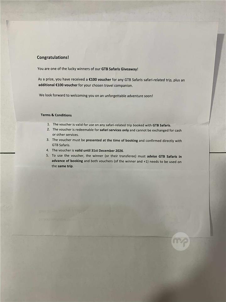 Voucher must be presented at time of booking and must advise GTB Safaris that you will be using the voucher for 2 people