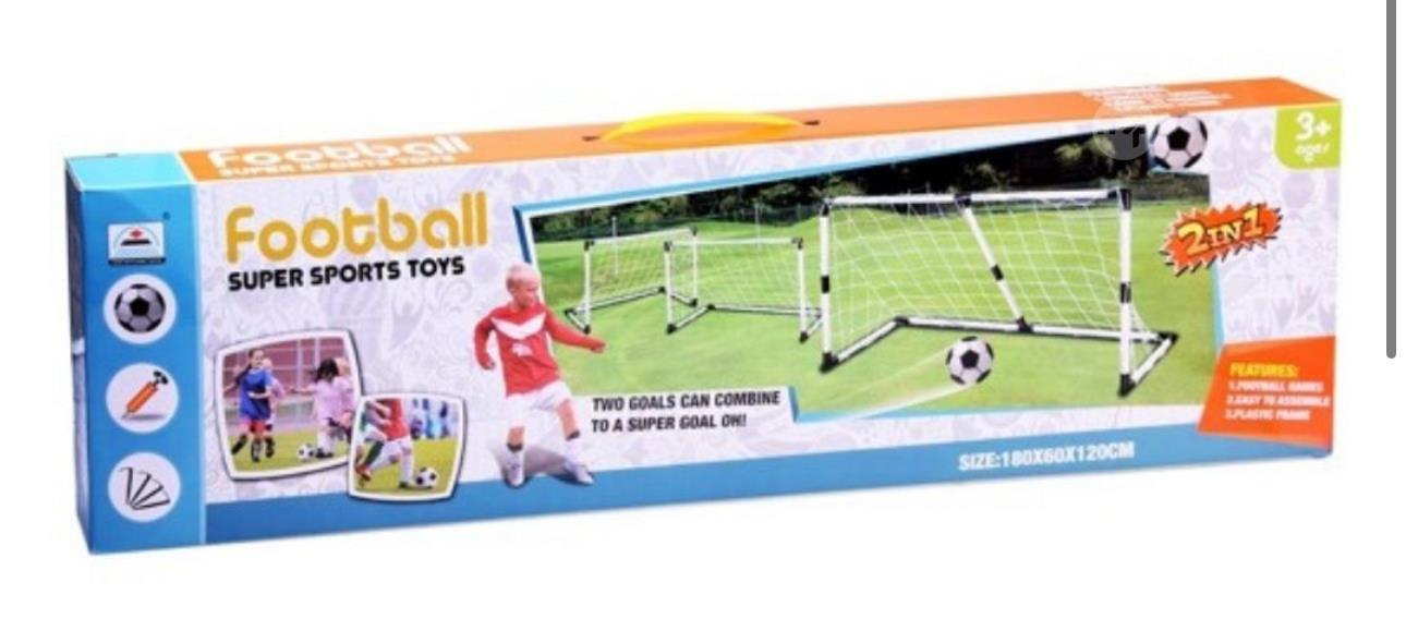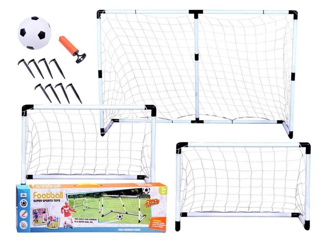 The set consists of one large goal post made of plastic (180 x 120 cm) which can be transformed into two smaller ones (92 x 65 cm). Ball, pump & anchors are included in the set. Easy to assemble.
