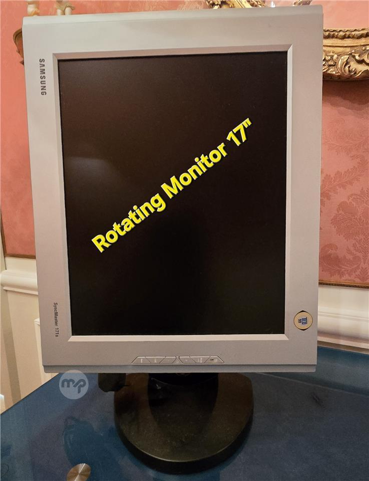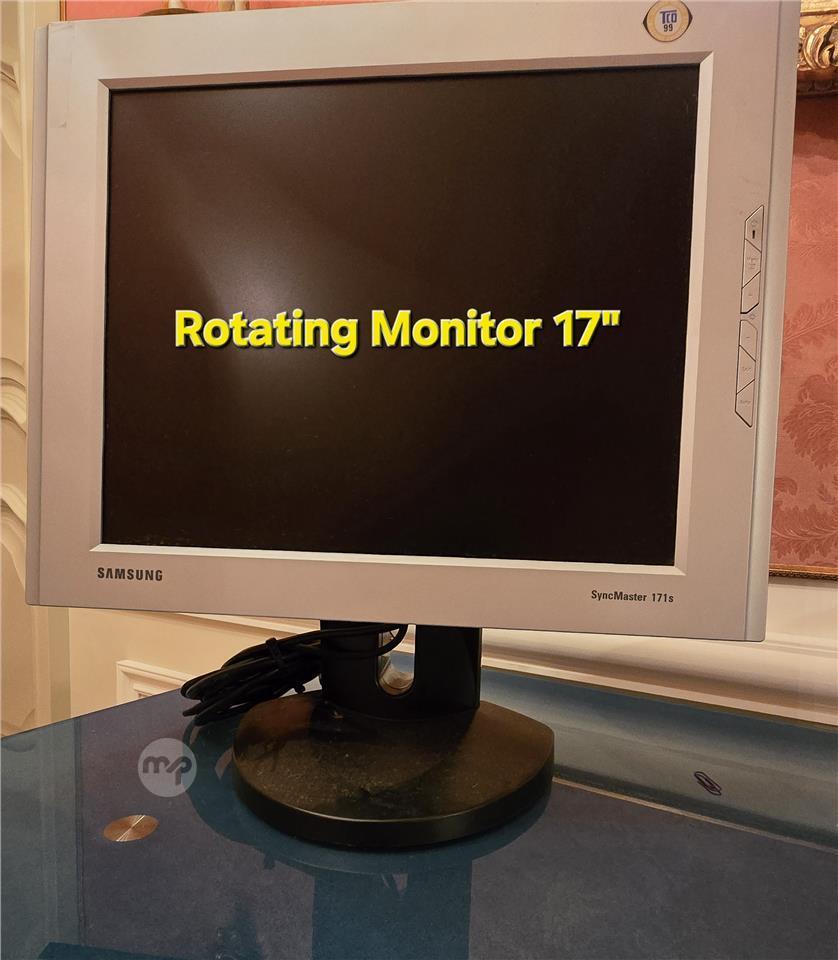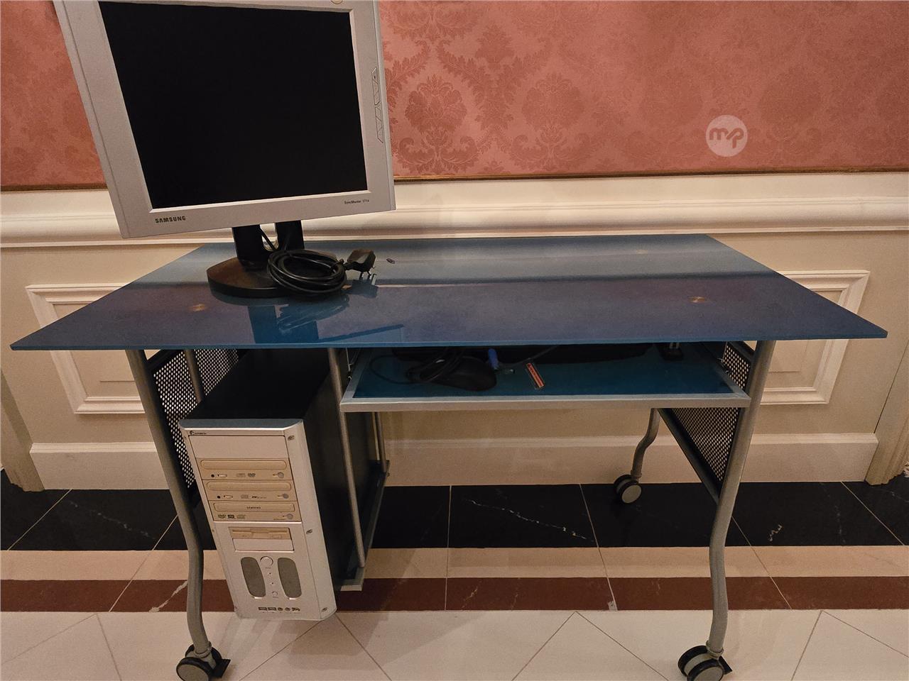 Office Desk with beautiful, blue glass top. Heavy duty with very comfortable extendible keyboard drawer. Condition like new, no scratches or dents. Castors with functional brakes. Colour Samsung Monitor 17" with VGA connection. When bought, this was a high-end product with rotation option from portrait to landscape. Ideal for CCTV cameras viewing.